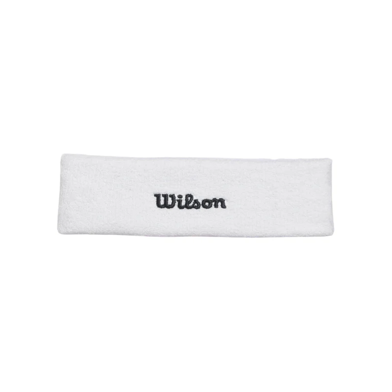 Wilson présente un bandeau éponge classique et intemporel dans une version blanche épurée, soulignée par un logo noir contrastant au centre pour une touche sobre et élégante.
