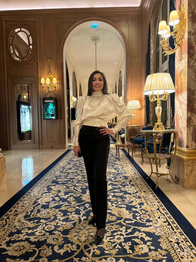 L’élégance intemporelle se révèle dans cette blouse en soie raffinée, spécialement conçue pour sublimer votre silhouette. Son col montant sophistiqué, délicatement fermé par une rangée de boutons discrets au dos, incarne le chic parisien.