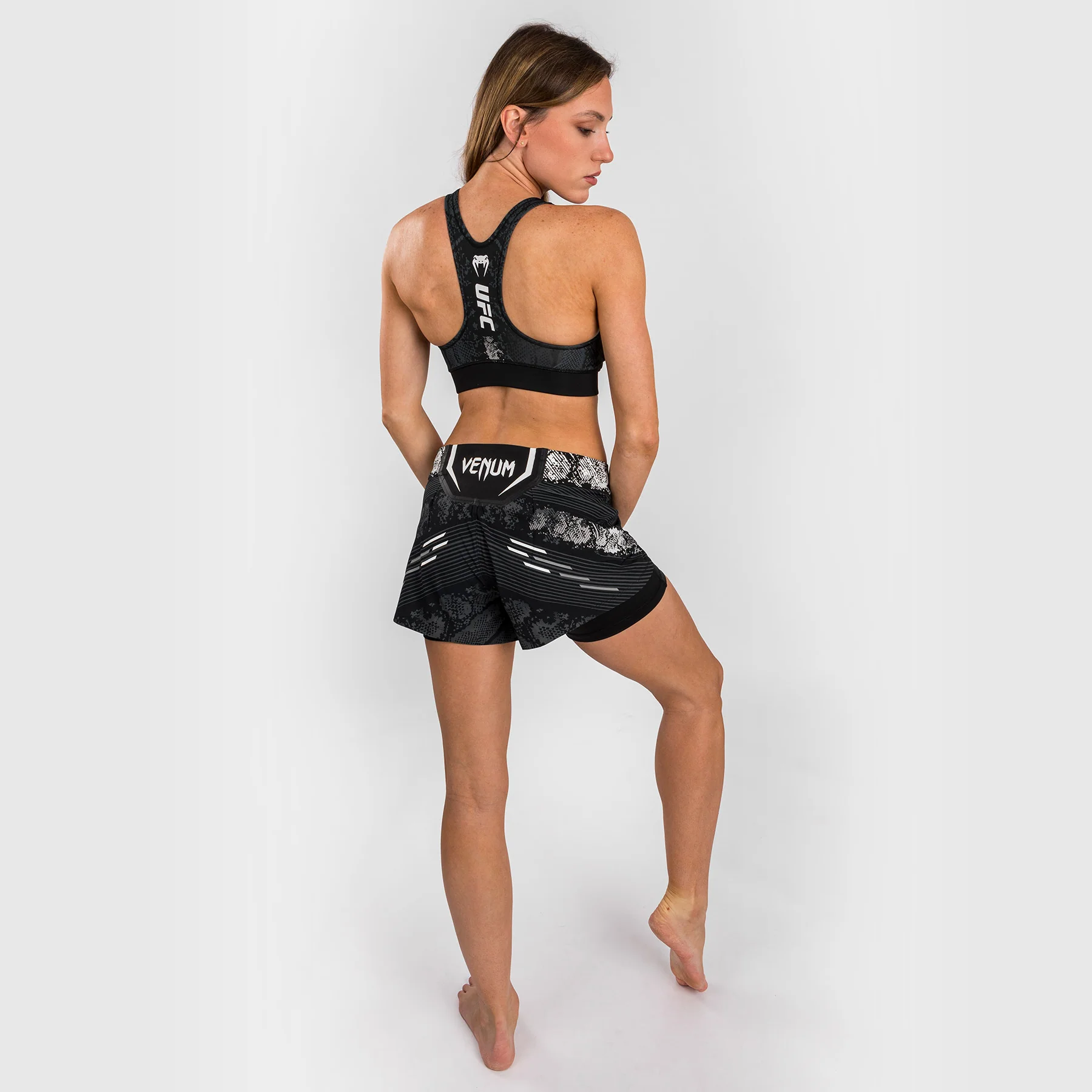Le design audacieux de ce soutien-gorge de sport noir, avec des motifs sublimés en peau de serpent et des détails blancs des logos Venum et UFC, est un clin d’œil à l’expérience de l’adrénaline que l’on ressent lorsqu’on entre dans l’Octogone.