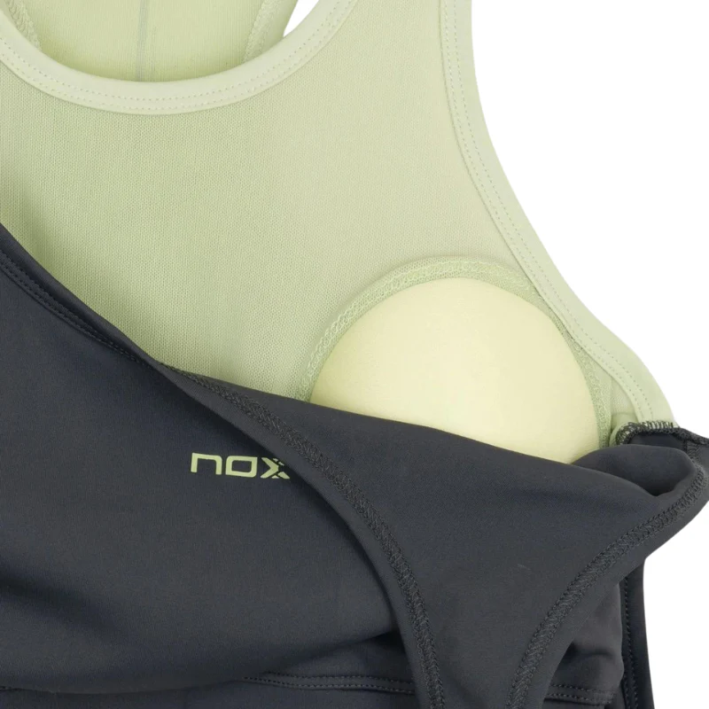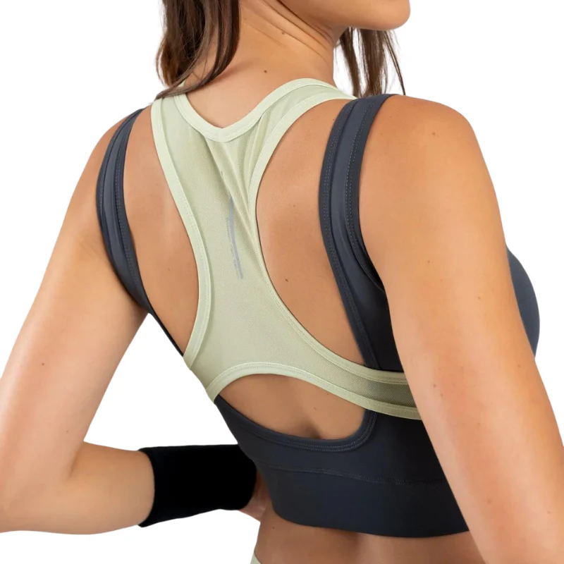 Avec un design sportif et élégant, cette brassière arbore une teinte grise contrastée par des touches de vert clair, pour une allure moderne et dynamique.