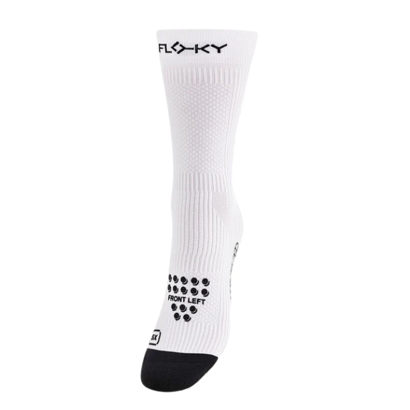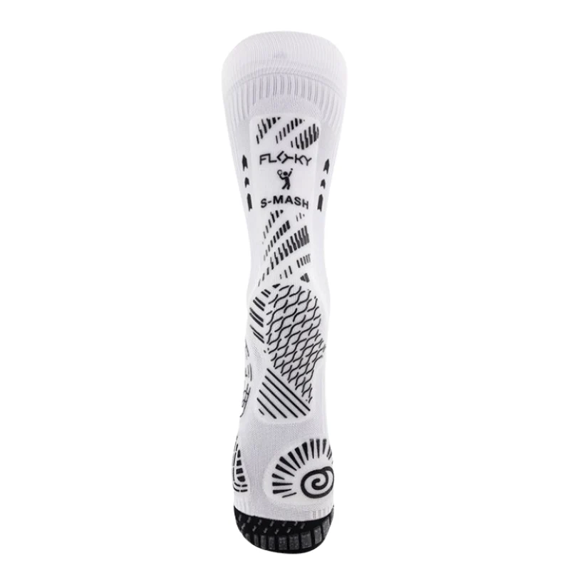 Découvrez la S-Mash 3D blanche, la nouvelle génération de chaussettes biomécanique Floky pensées pour les sports de raquette comme le padel et le tennis.