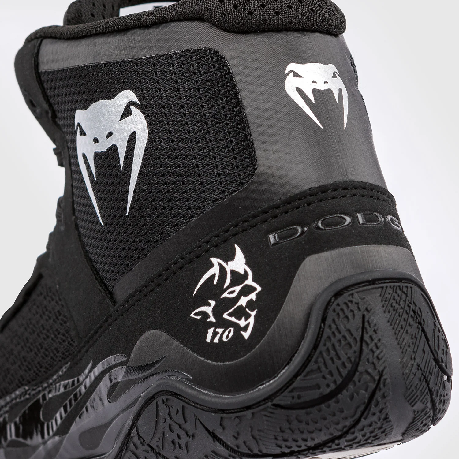 Les flammes emblématiques de la Dodge Challenger s’étendent sur les côtés, avec les logos Venum et Demon 170 en argent et en noir respectivement sur l’extérieur de la chaussure. Le logo Dodge est positionné à l’arrière en noir.