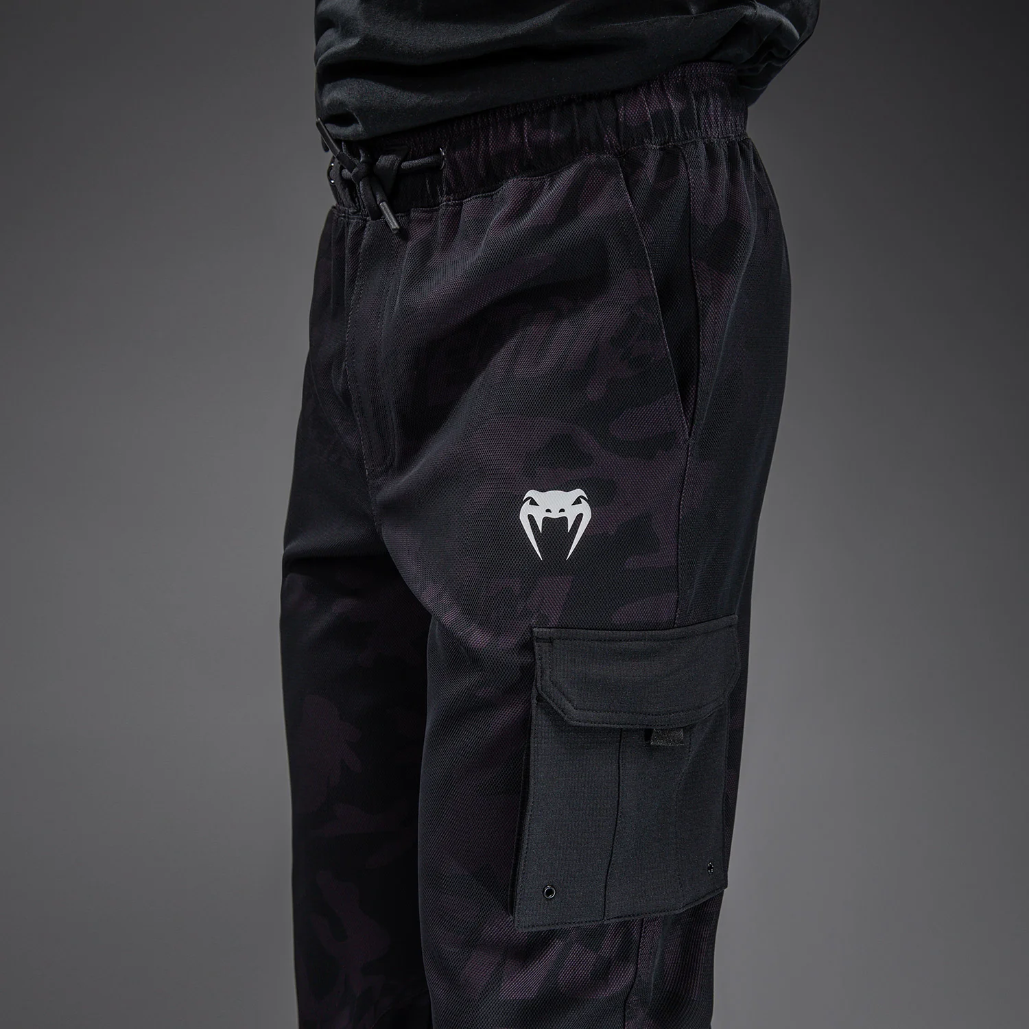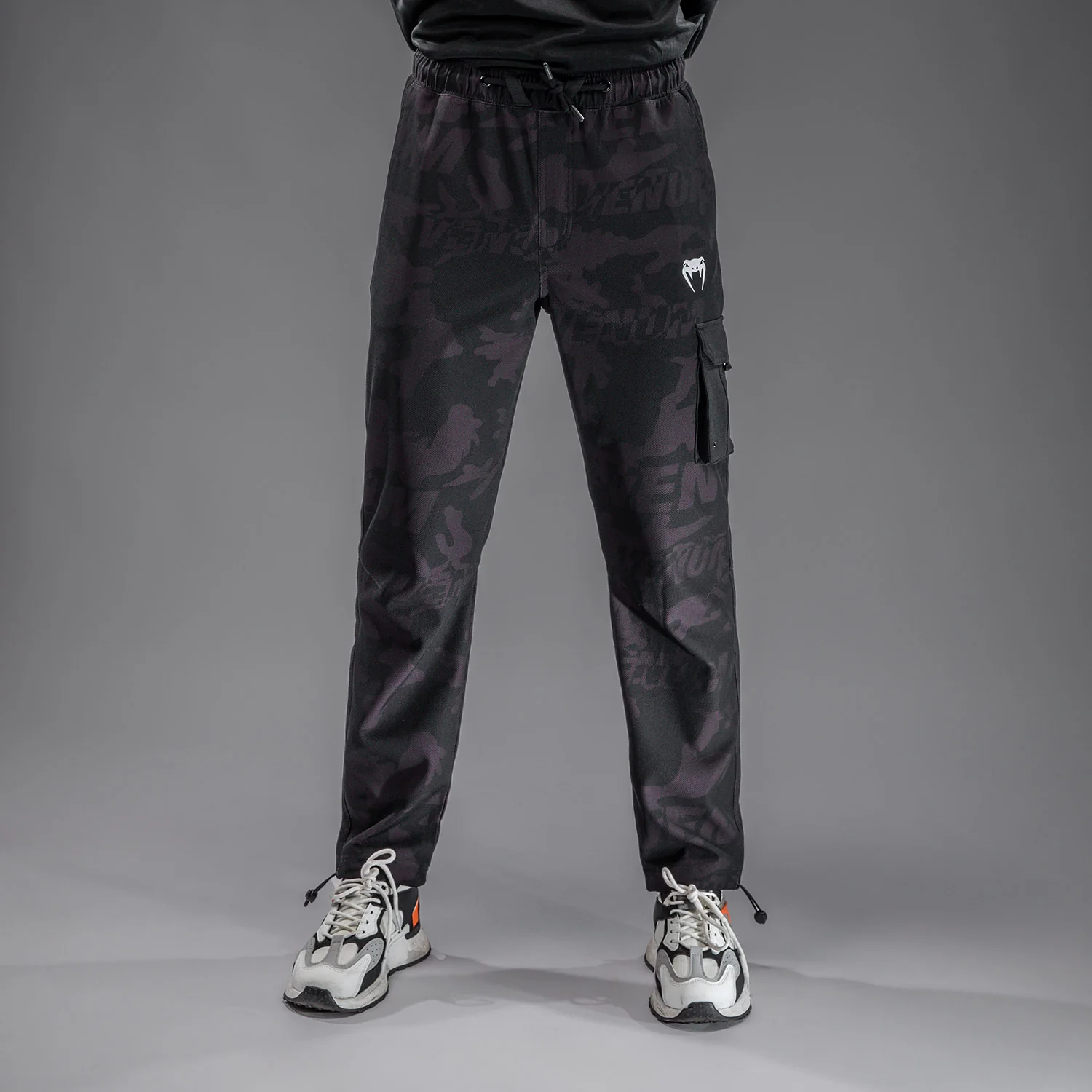 Le pantalon de survêtement pour homme Venum Trooper présente des poches cargo noires au niveau de la cuisse et à l’arrière pour compléter l’imprimé subtil noir/sable du pantalon. La taille élastiquée avec cordon de serrage offre un bon maintien, tandis que le tissu a une légère élasticité pour vous accompagner dans vos mouvements.