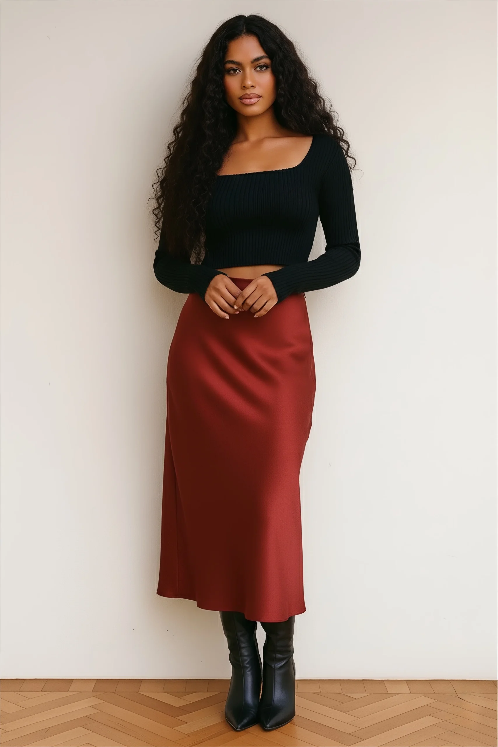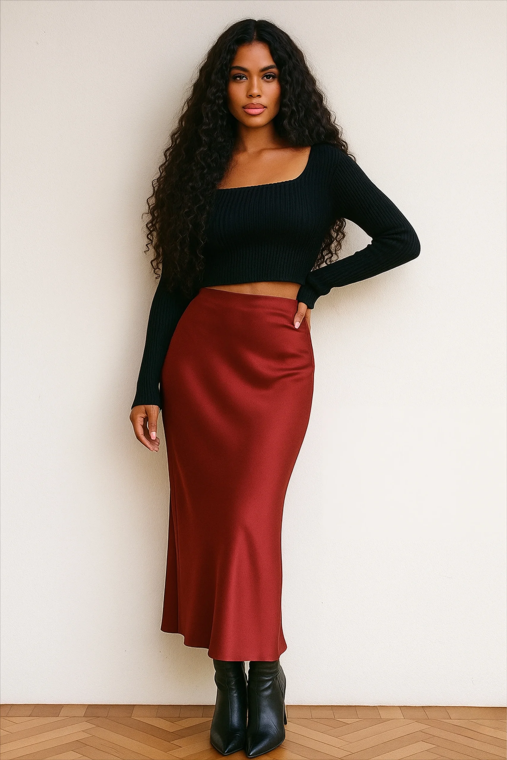 Description : Coupe : mi-longue, légèrement évasée Matière : tissu fluide, agréable à porter Couleur : bordeaux profond, facile à assortir