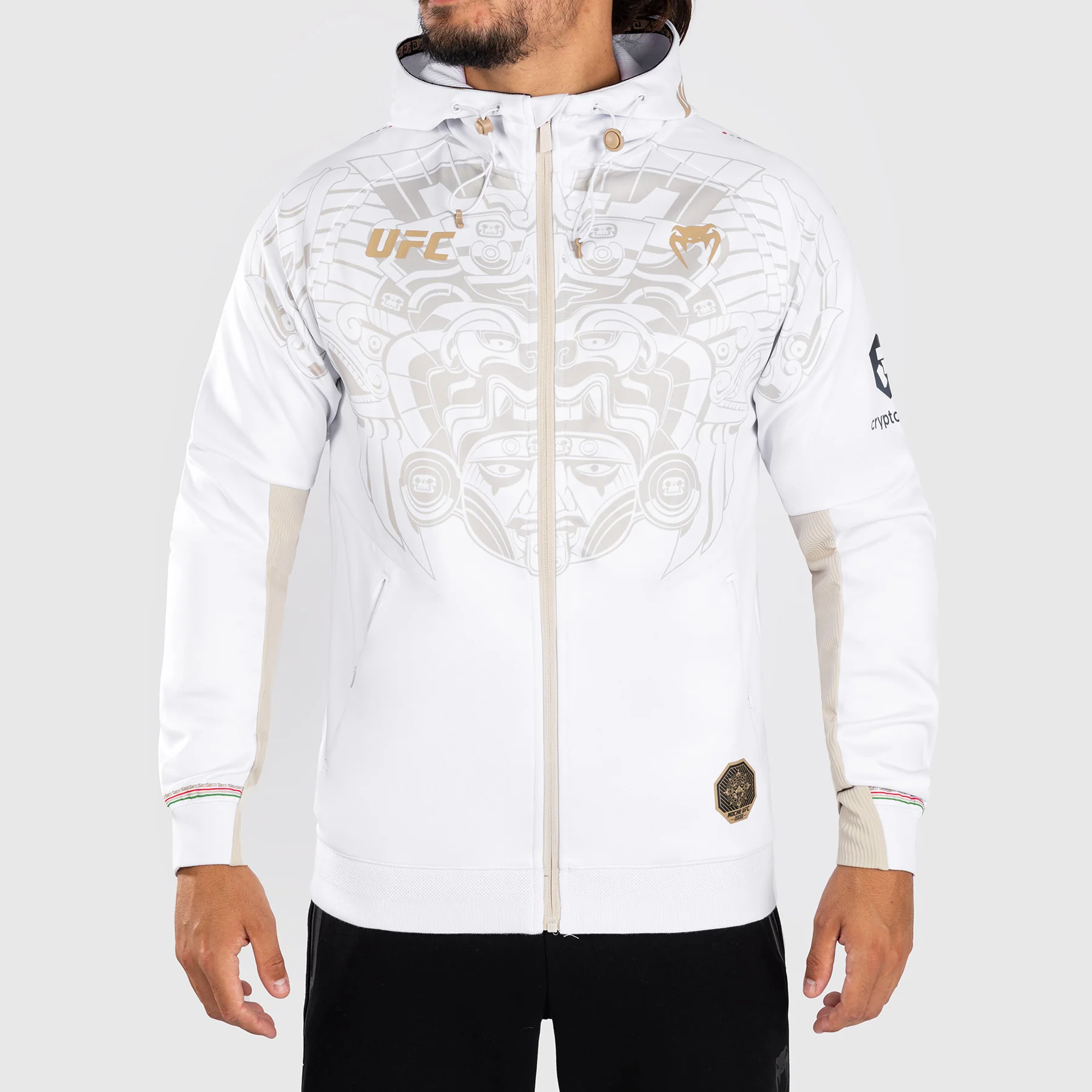 Le Noche UFC Authentic Fight Night par Venum Men’s Walkout Hoodie en blanc présente cinq dieux aztèques primordiaux sur la poitrine et la capuche. Les têtes d’aigle atteignant de chaque côté du graphique représentent Itzcuauhtli, symbolisant la résilience et le dévouement de l’esprit combatif du peuple mexicain.