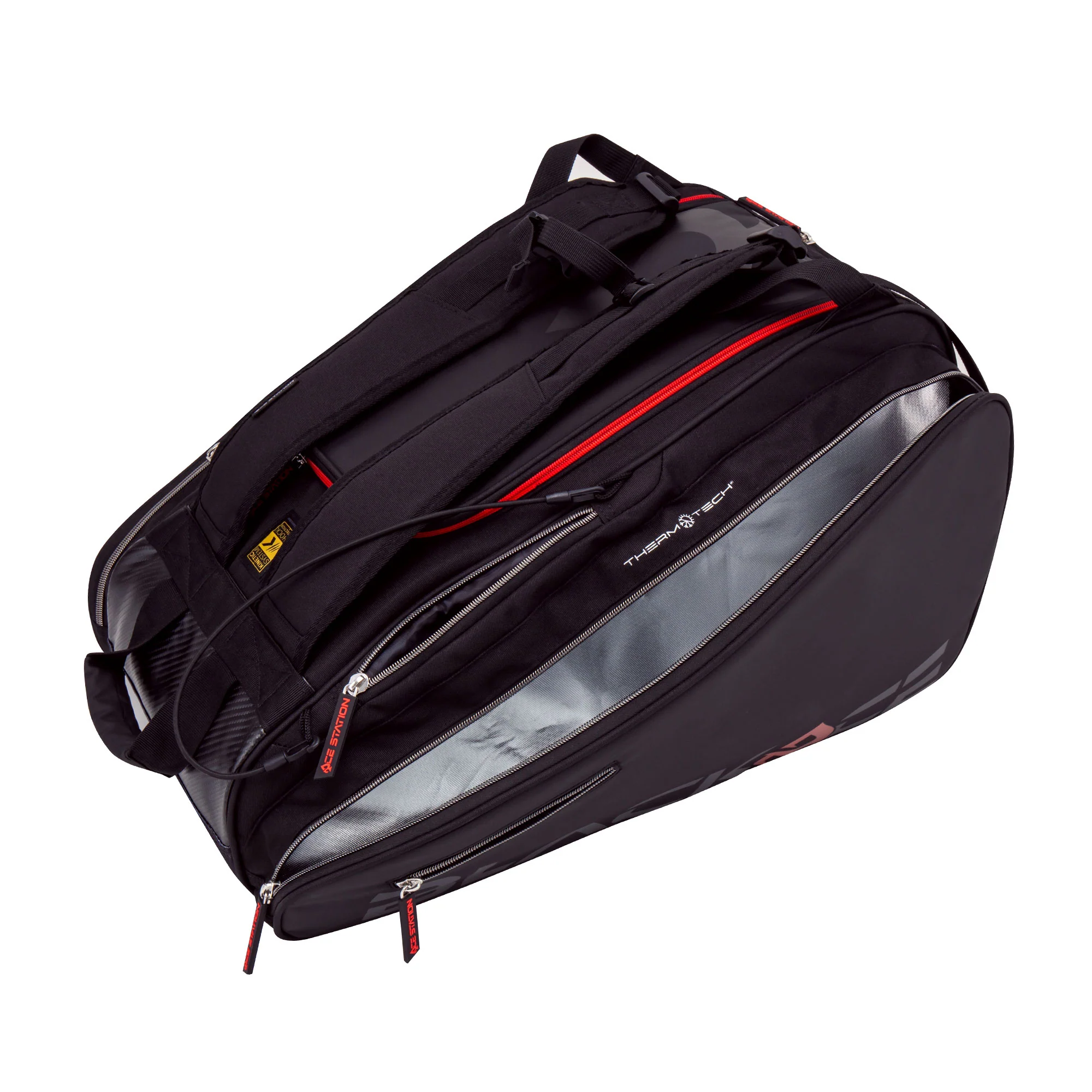 Le Tour Bag peut accueillir jusqu’à six raquettes dans ses grands compartiments, dont un compartiment thermique spécialement prévu pour protéger le matériel des variations de température, que ce soit en plein soleil ou en plein hiver.