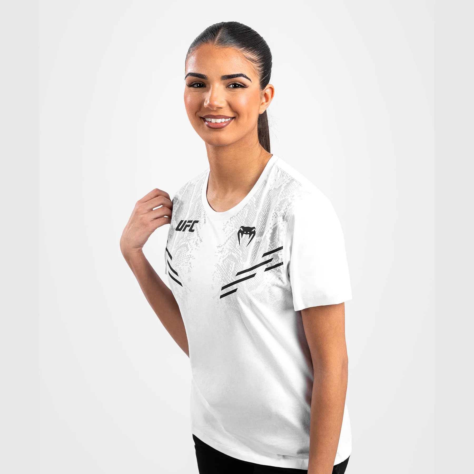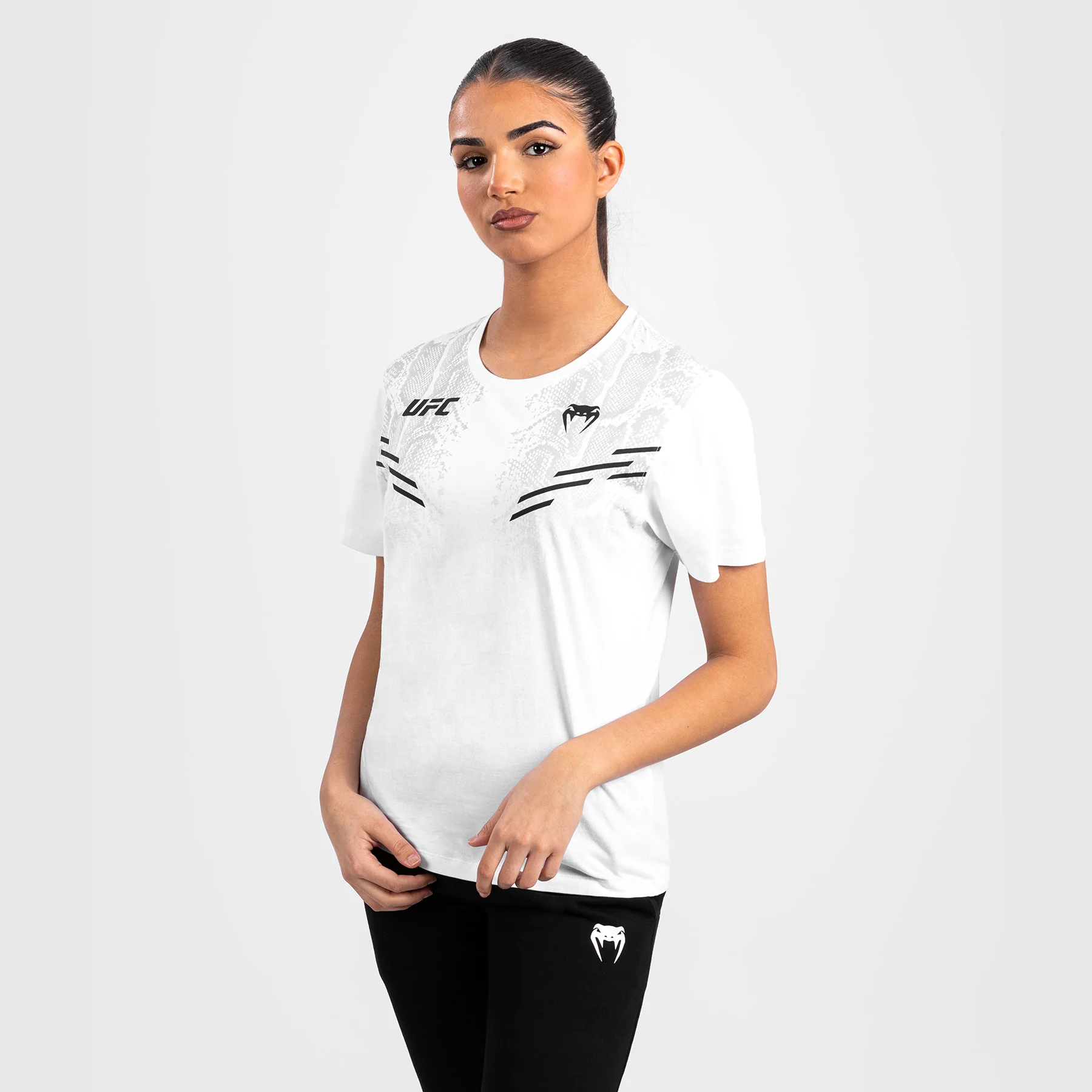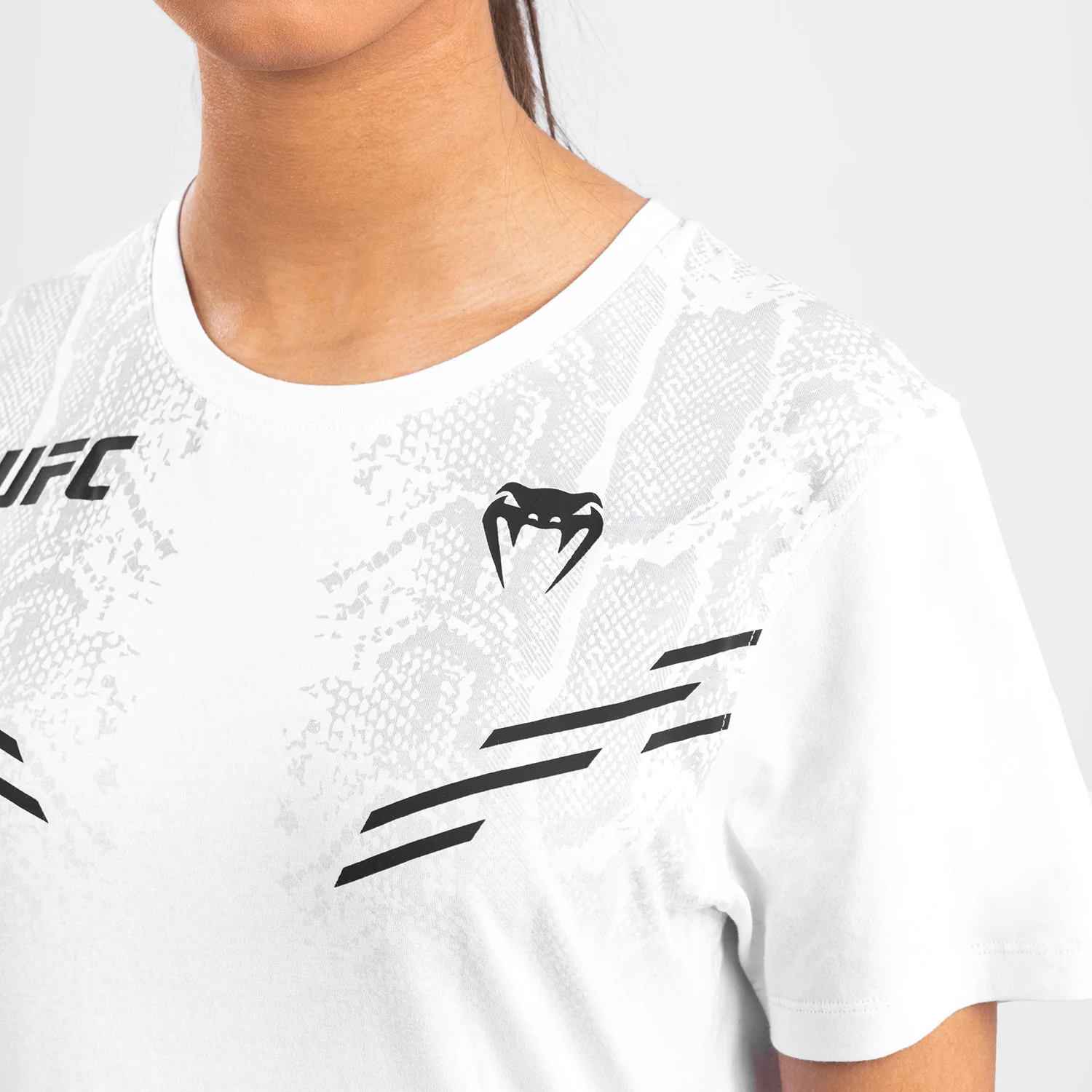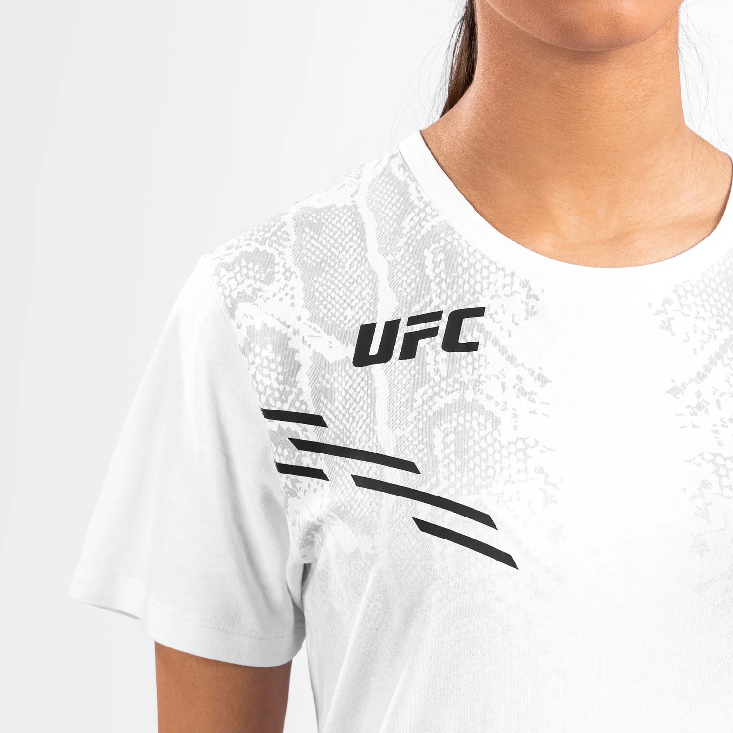 Le design subtil, avec des graphismes en peau de serpent et des logos noirs Venum et UFC, est un clin d’œil à l’expérience pleine d’adrénaline d’entrer dans l’Octogone.
