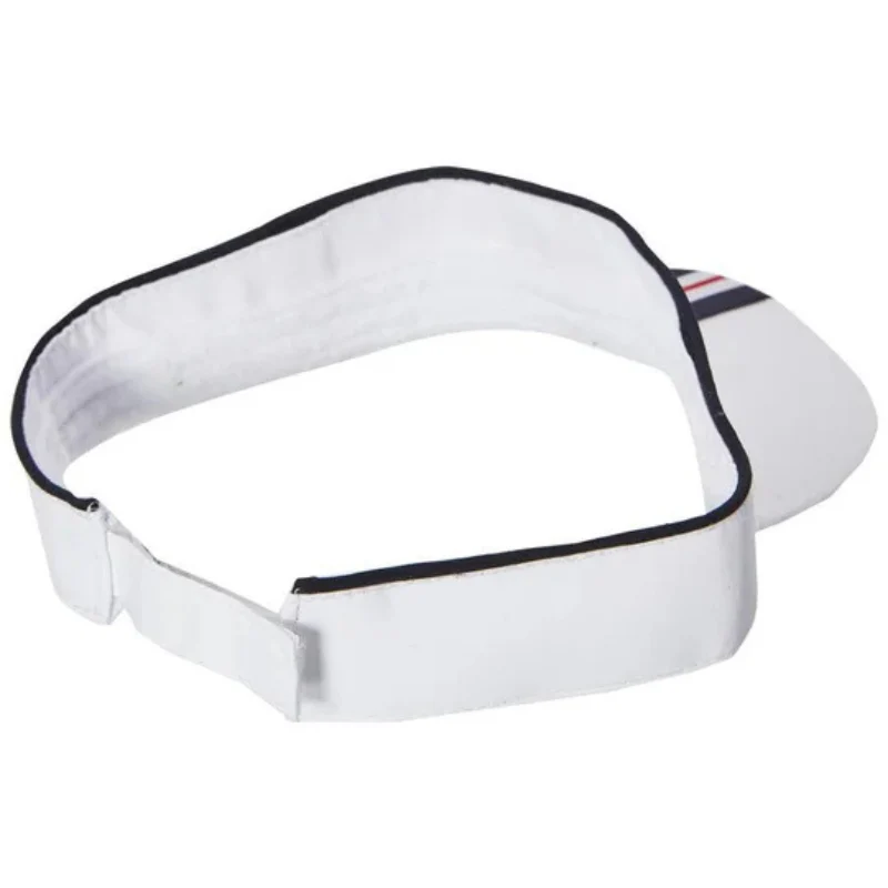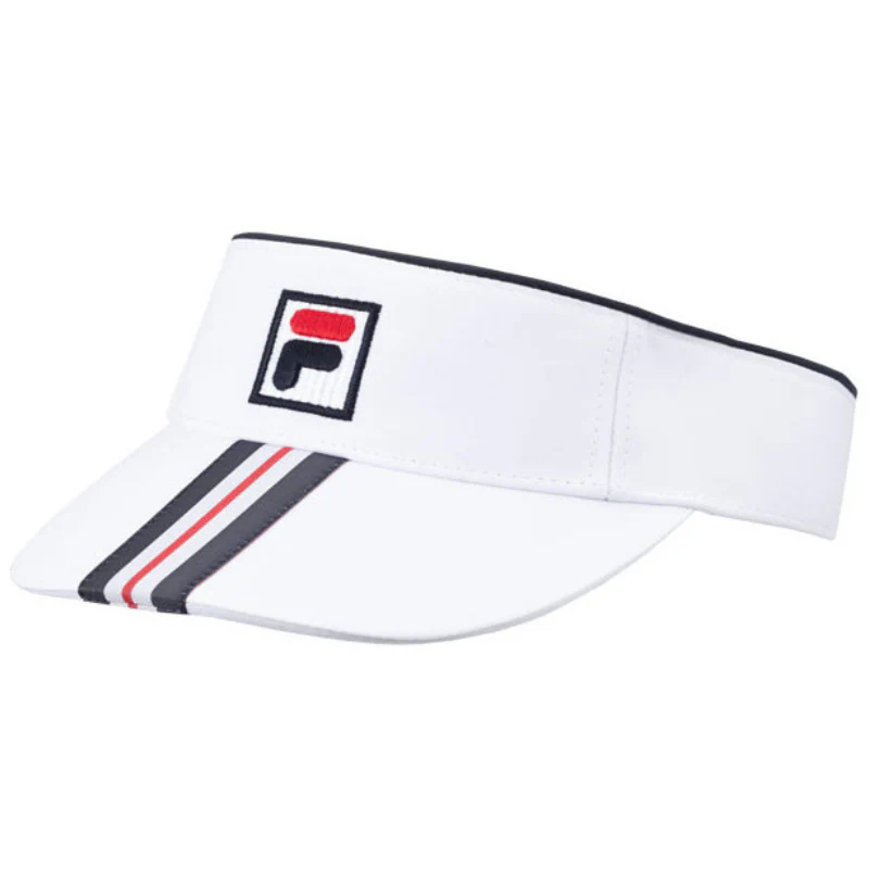 Cette visière blanche est décorée de rayures bleu et rouge sur le devant, ajoutant une touche dynamique à son design épuré. Le logo Fila est subtilement brodé au centre, affirmant son identité sportive.