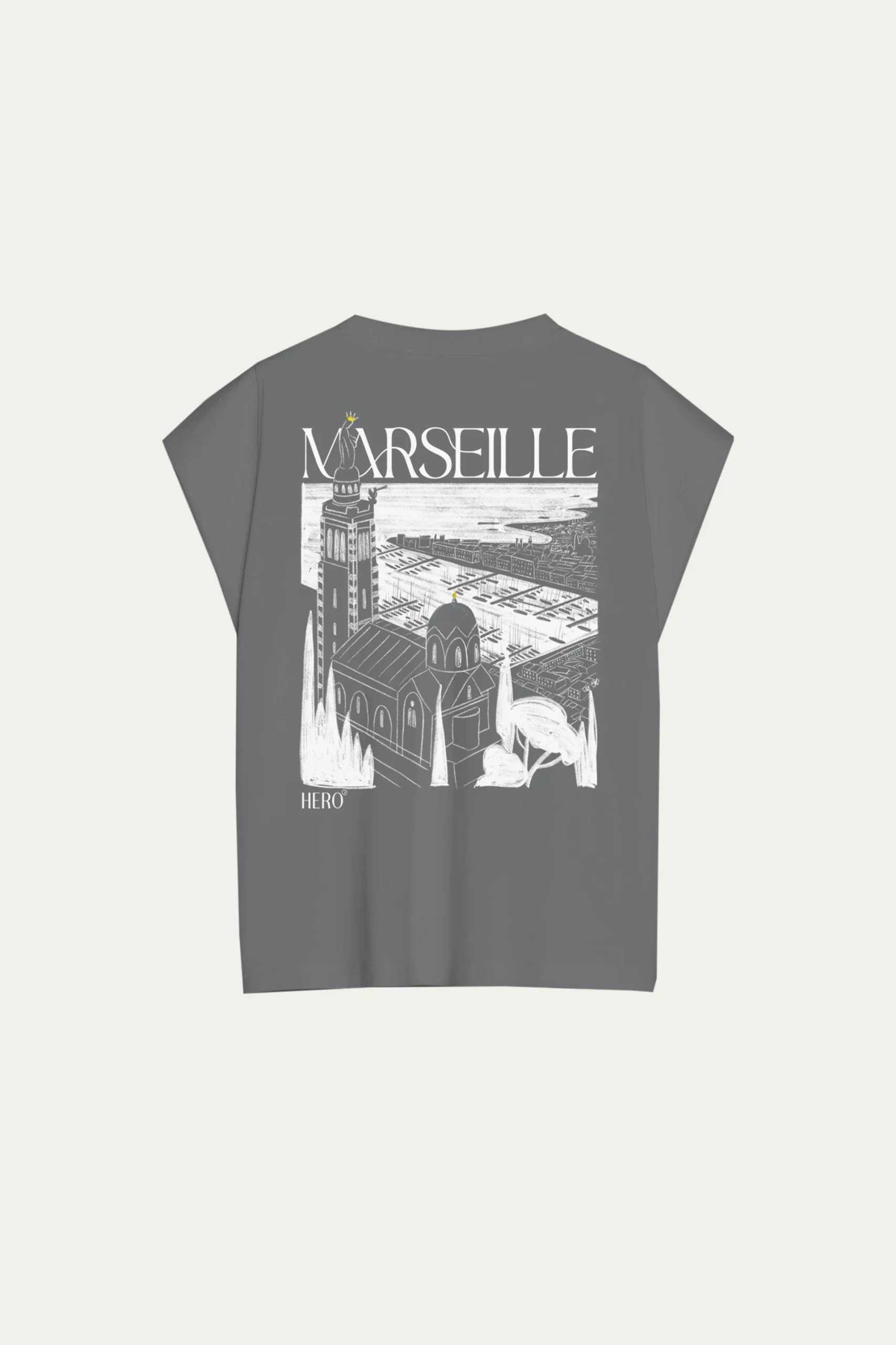 Un hommage graphique à la cité phocéenne. Ce t-shirt femme rend hommage à Marseille avec une illustration exclusive de la Bonne Mère surplombant le Vieux-Port, imprimée dans un contraste blanc élégant.Confectionné en coton, il présente une coupe droite et un col rond classique. À l’avant, le logo HERO apposé discrètement sur la poitrine signe l’ensemble […]